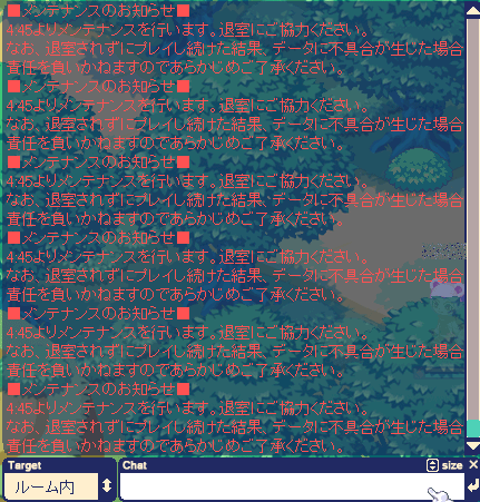 約10時間後のメンテのための「退室に協力してね☆」告知のログで埋まるチャット欄。